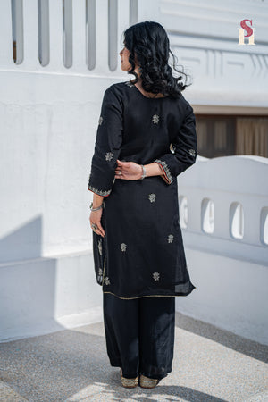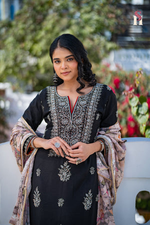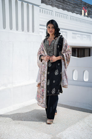 Drape yourself in timeless elegance with this exquisite black Chikankari suit, a true reflection of Mughlai artistry. Crafted from premium muslin fabric sourced from Surat and paired with a printed chunan dupatta, this ensemble embodies luxury and heritage. The suit features intricate Chikankari work including murri, bakhiya, and tepchi stitches—each one delicately hand-embroidered over two months of meticulous craftsmanship. Further adorned with dazzling Australian sequins, fine kardana detailing, and bead embroidery, this piece showcases a harmonious blend of traditional charm and contemporary finesse. A rare and regal creation, perfect for those who appreciate the richness of handcrafted elegance.