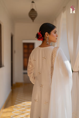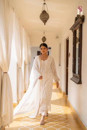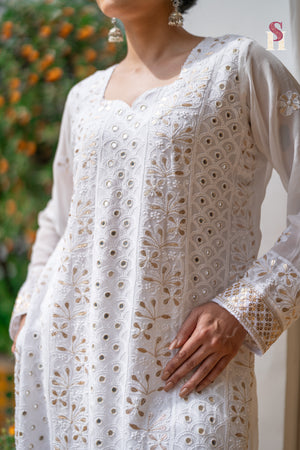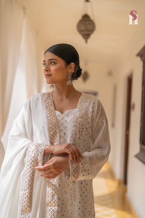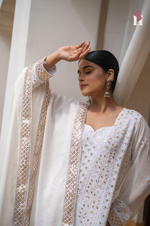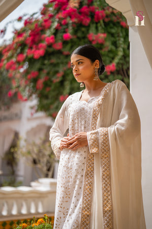 Elegant white georgette suit with a matching dupatta, adorned with intricate gota patti, mirror work embroidery, and delicate chikankari craftsmanship. A masterpiece of artisanal beauty, crafted over two months for timeless grace.