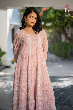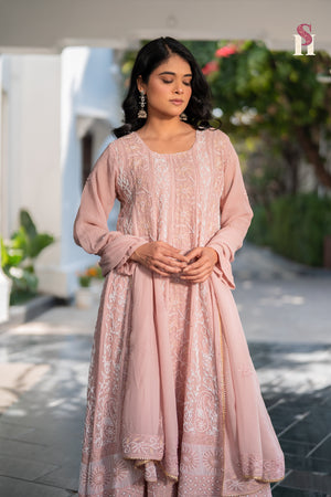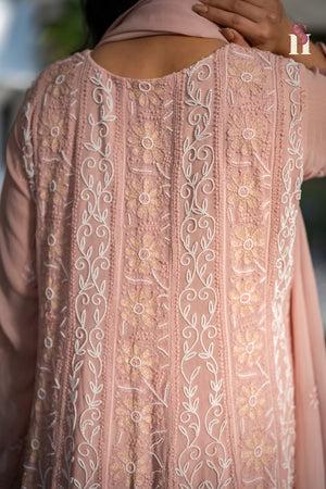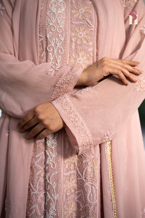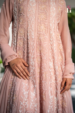 A vision of grace, this georgette ensemble drapes effortlessly, exuding timeless charm in a delicate light mouse hue. Adorned with intricate Chikankari and embroidery. It beautifully blends tradition with modern elegance. The artistic design ensures both comfort and sophistication, making it perfect for grand celebrations and festive gatherings.