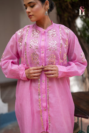 Onion Pink Elegance, experience the allure of handcrafted luxury with this Onion-colored Mal fabric ensemble, adorned with the exquisite shimmer of Mukesh work. Delicately crafted over two months, every detail reflects artistry, patience, and tradition. Light, breathable, and effortlessly elegant, this piece is a celebration of heritage and craftsmanship.
