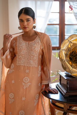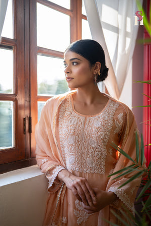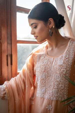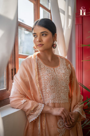Embrace grace in this sunlit copper mal suit. Exquisitely adorned with Chikankari and intricate embroidery. Featuring Ghass Patti, Bakhiya, Murri, Kardana, beads, and sequins. This handcrafted masterpiece is a true testament to elegance and tradition.