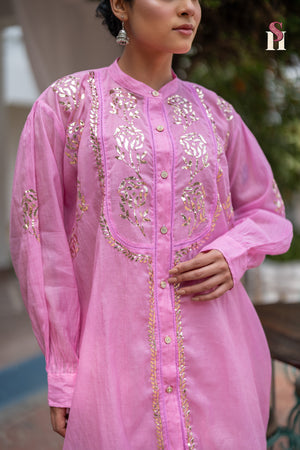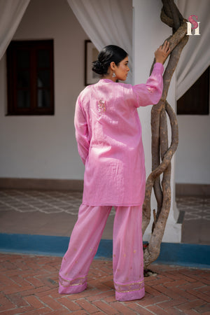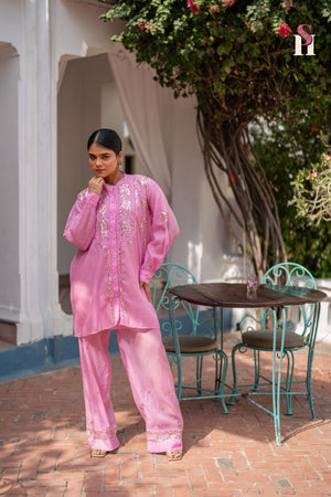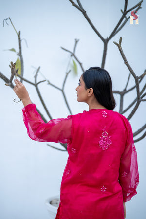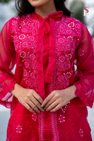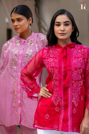 Paired with the Magenta Organza Top, a sheer masterpiece that floats with grace. Adorned with hand-embroidered Ghass Phanda, Murri, and shimmering Mukesh, it carries the legacy of Chikankari in every stitch.