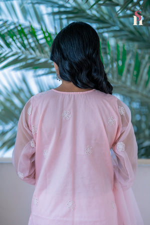 The onion pink organza suit is sheer sophistication, adorned with delicate Chikankari and a neckline subtly illuminated by intricate Kardana work—classic yet contemporary. 💫