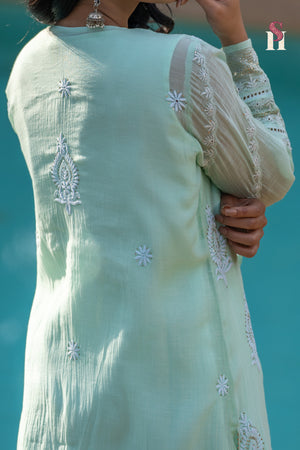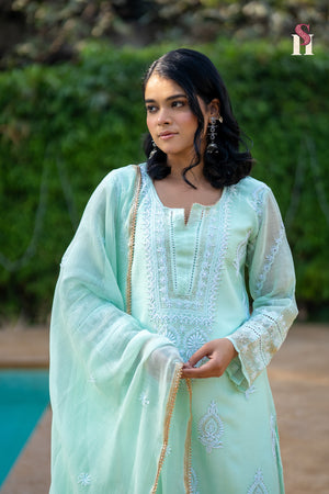 The mal suit, in calming sea green, is a canvas of heritage—hand-embroidered with Mukesh and Chikankari over two patient months. Every stitch reflects timeless artistry and soulful dedication. 🧵🌿