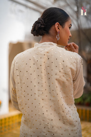 The georgette suit flows in soft pastels, brought to life with Resham Badla embroidery, shimmering mirrors, and delicate Kardana—an ode to tradition wrapped in modern elegance. ☁✨